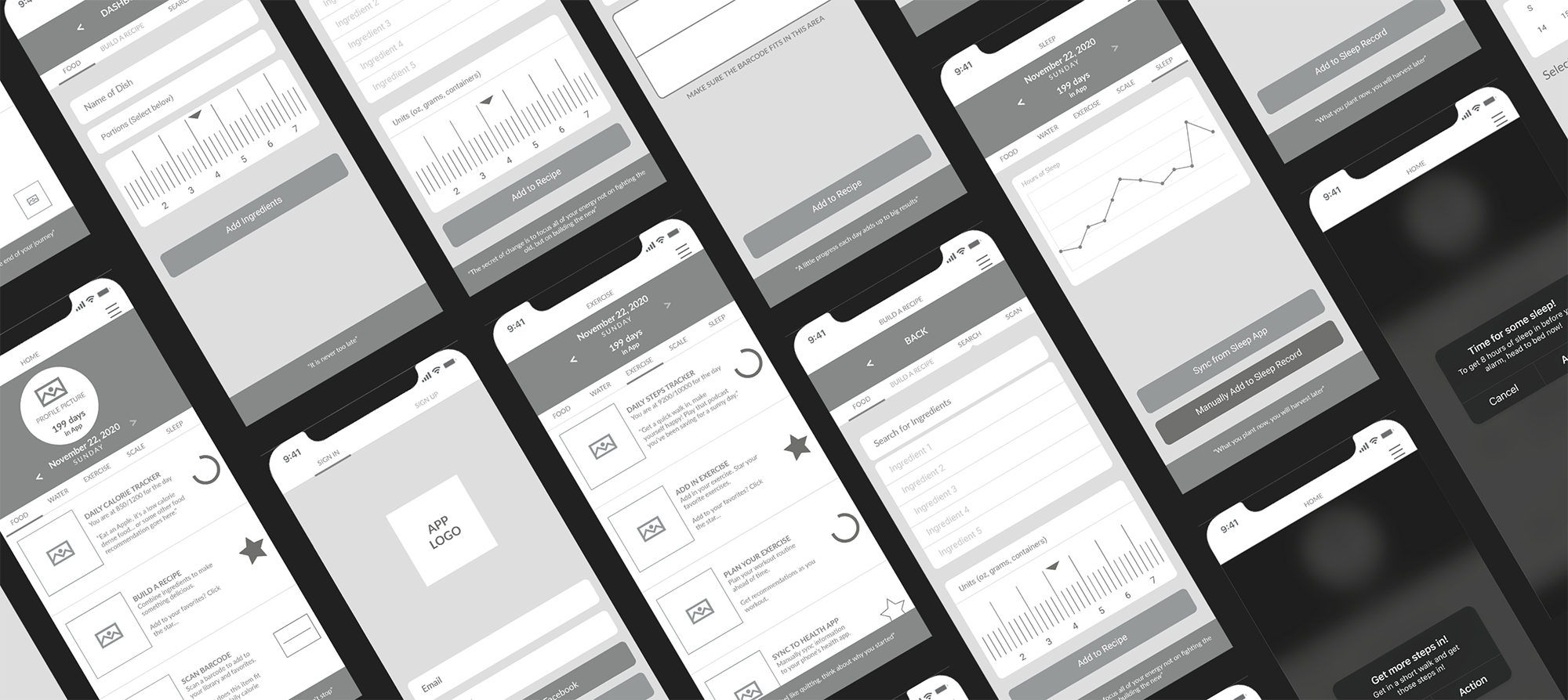 I explored multiple approaches for presenting the app’s functionality, focusing on layouts that supported easy navigation, clear feedback, and flexible tracking. Each wireframe aimed to balance usability with a motivating visual hierarchy.
