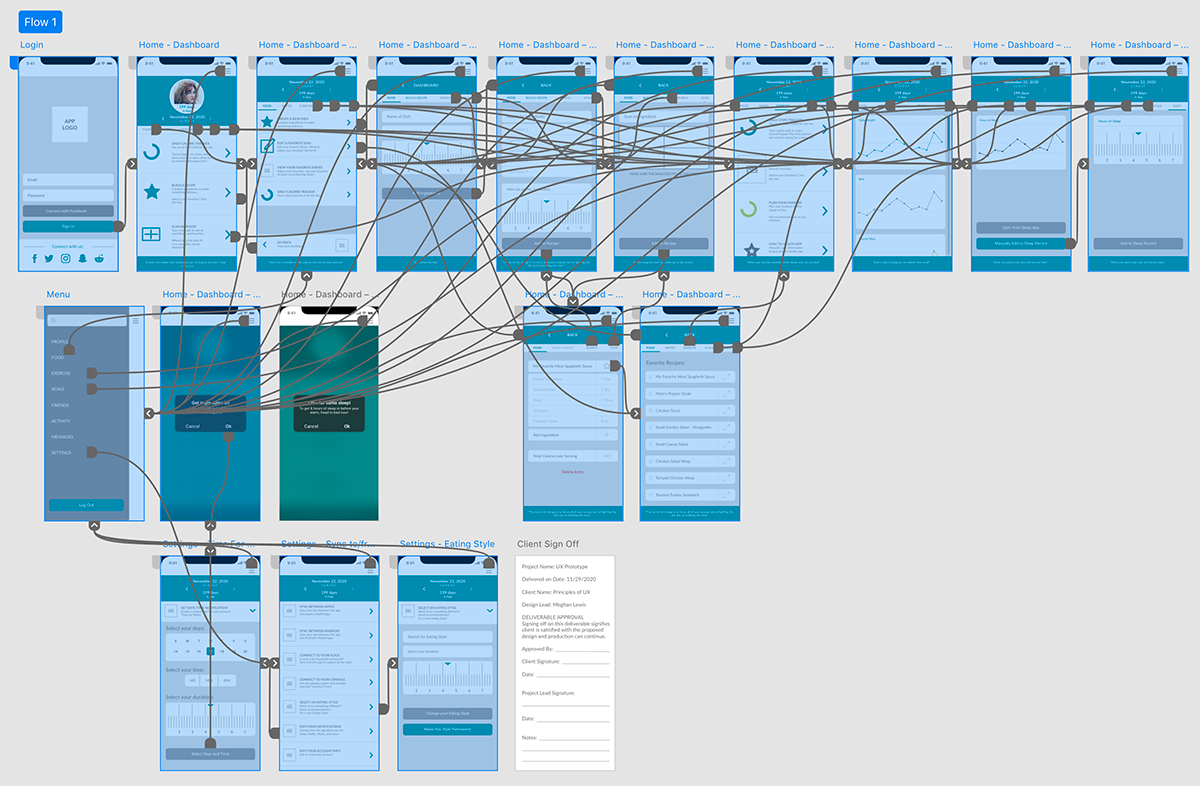I started with a straightforward linear workflow to map the essential user journeys: logging meals, tracking workouts, syncing devices, and reviewing progress. This allowed me to experiment with layout, information grouping, and visual hierarchy while staying focused on usability.