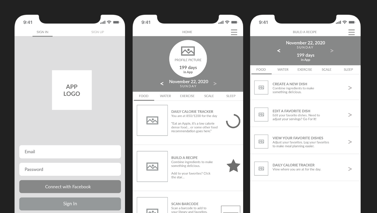 Wireframes provided a clear blueprint for interactions, including favoriting foods and workouts, adjusting dietary preferences, and tracking different eating styles. They made it easier to identify areas of friction and refine the flows before moving into higher fidelity design.