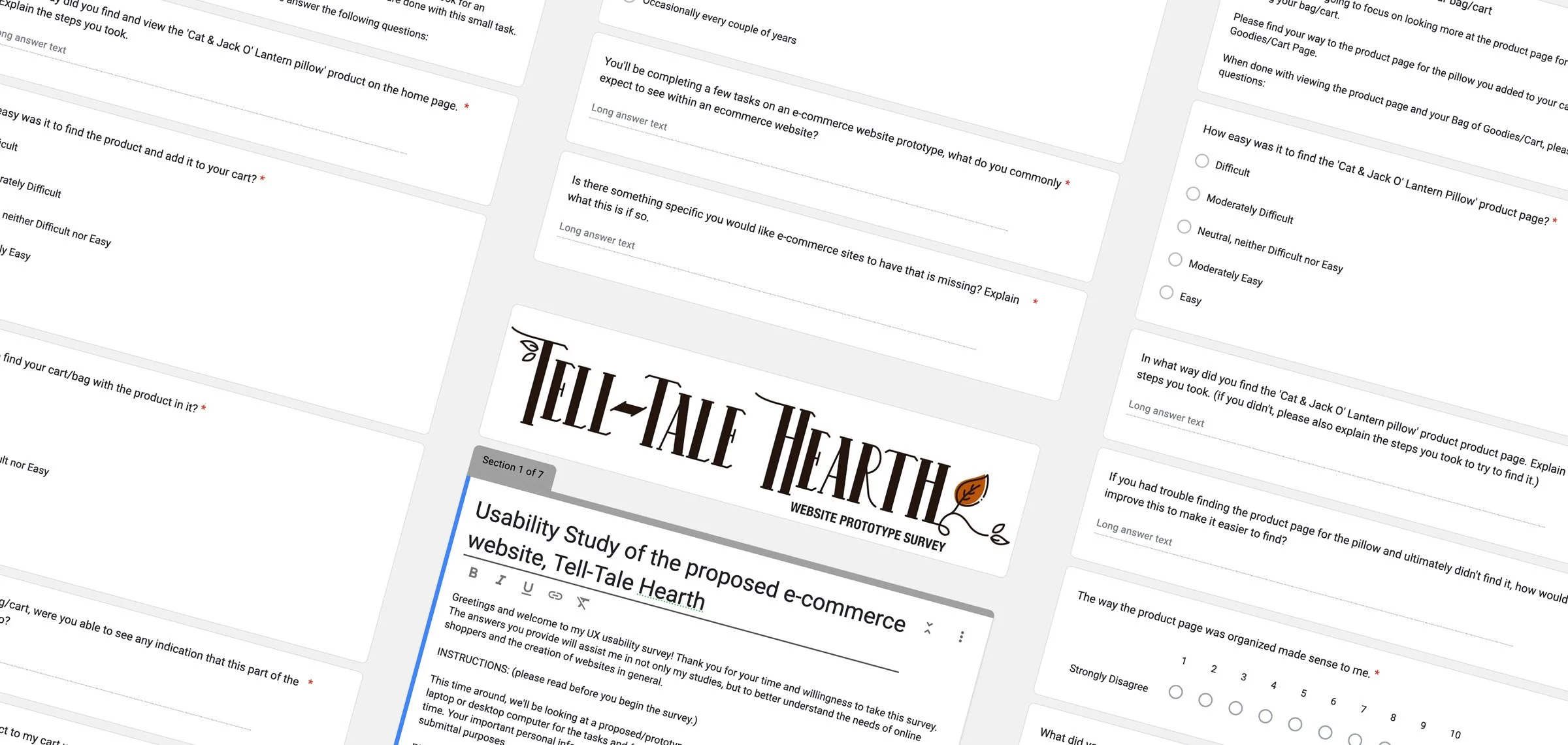The study evaluated how users explored and completed tasks within the Tell-Tale Hearth prototype. I focused on navigation clarity, product discovery, and checkout flow. For this study, I conducted a 30-45 minute test to evaluate the user experience of the Tell Tale Hearth website. This included a couple questions with interaction, navigating within the website, pain points, reasons for use, and competitive analysis.
