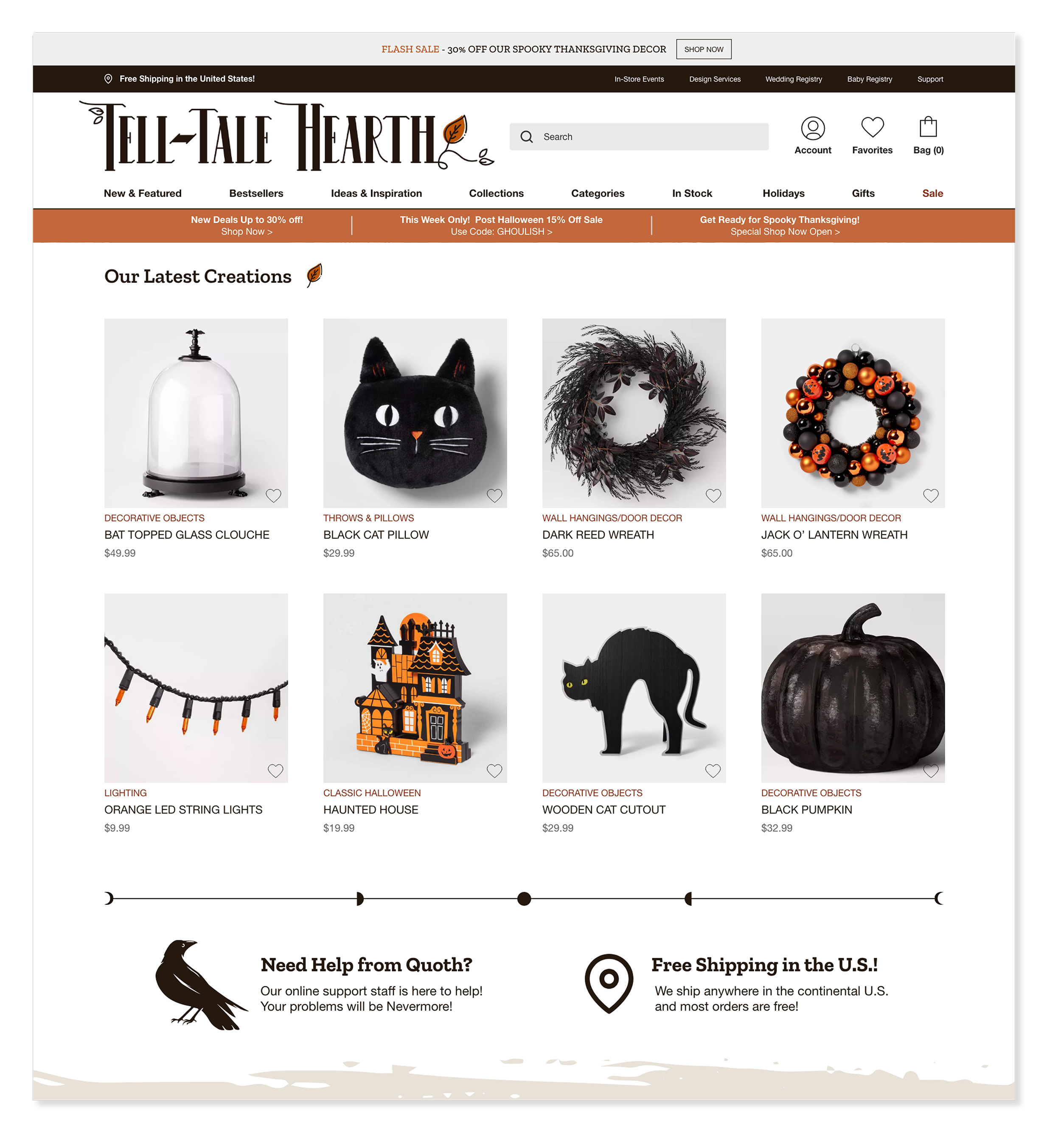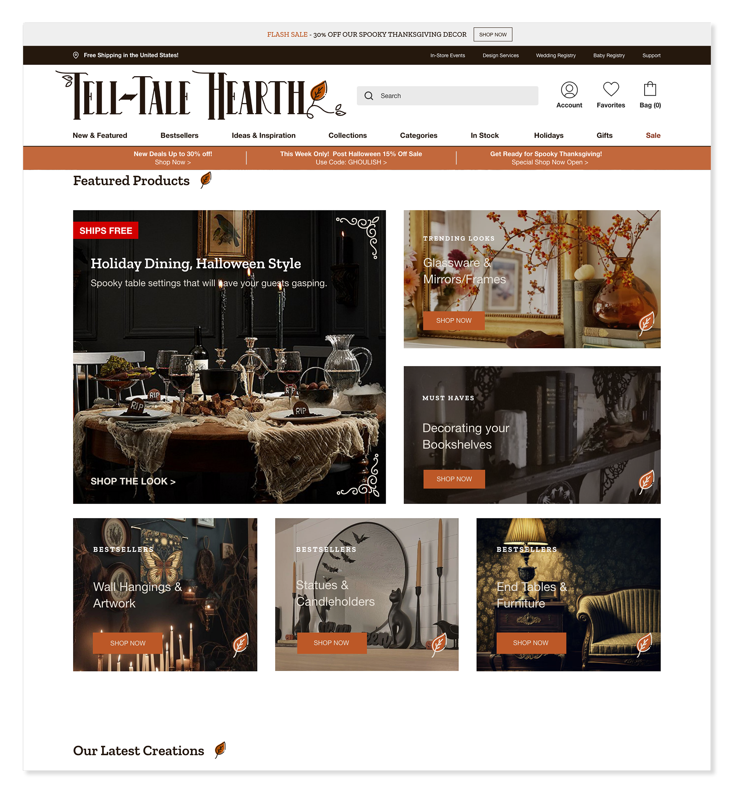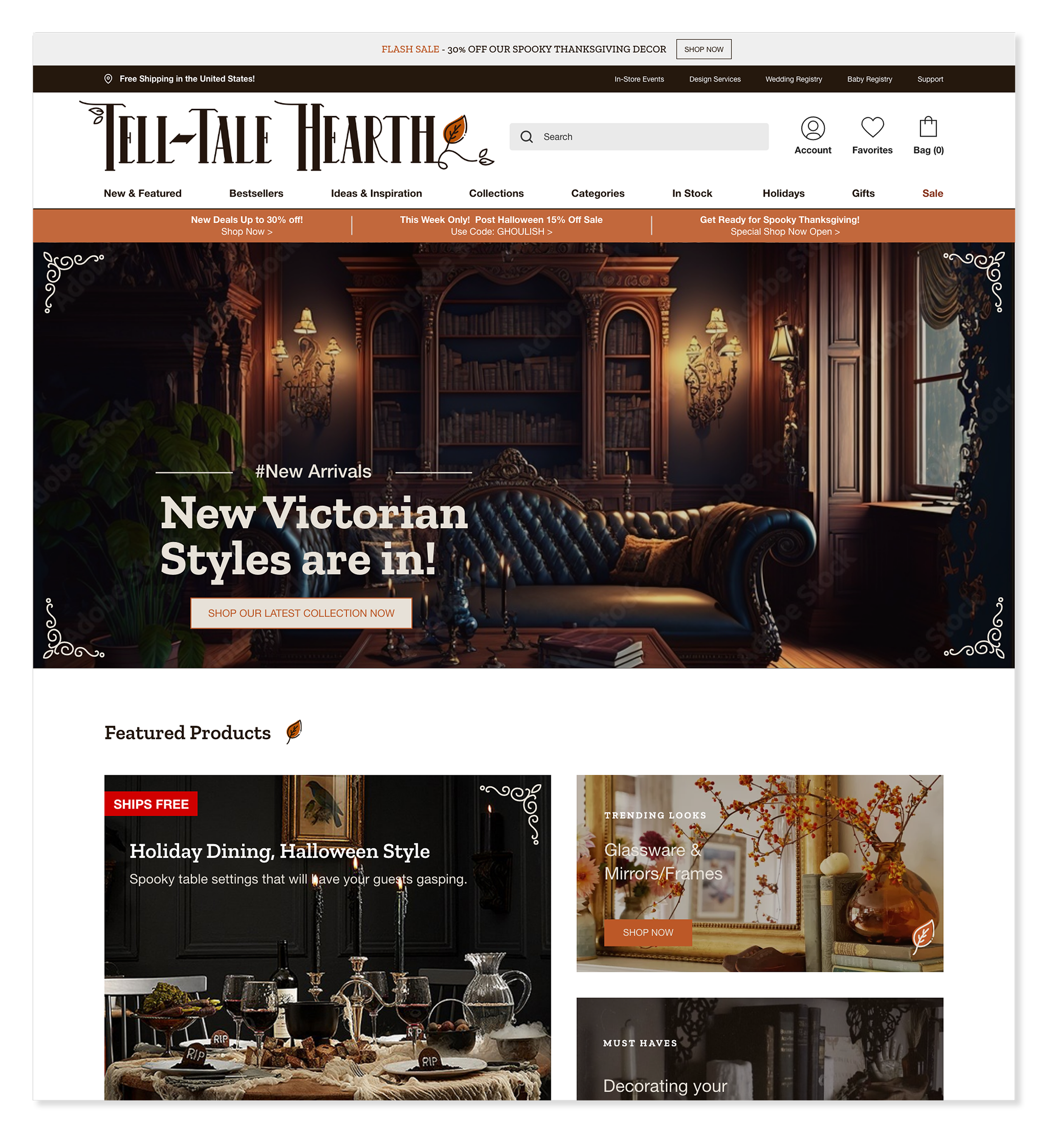 The homepage served as the introduction to Tell-Tale Hearth’s identity. The goal was to draw users into the atmosphere immediately while maintaining clarity and orientation. Featured collections, supporting imagery, and a structured layout worked together to establish tone without overwhelming the experience.