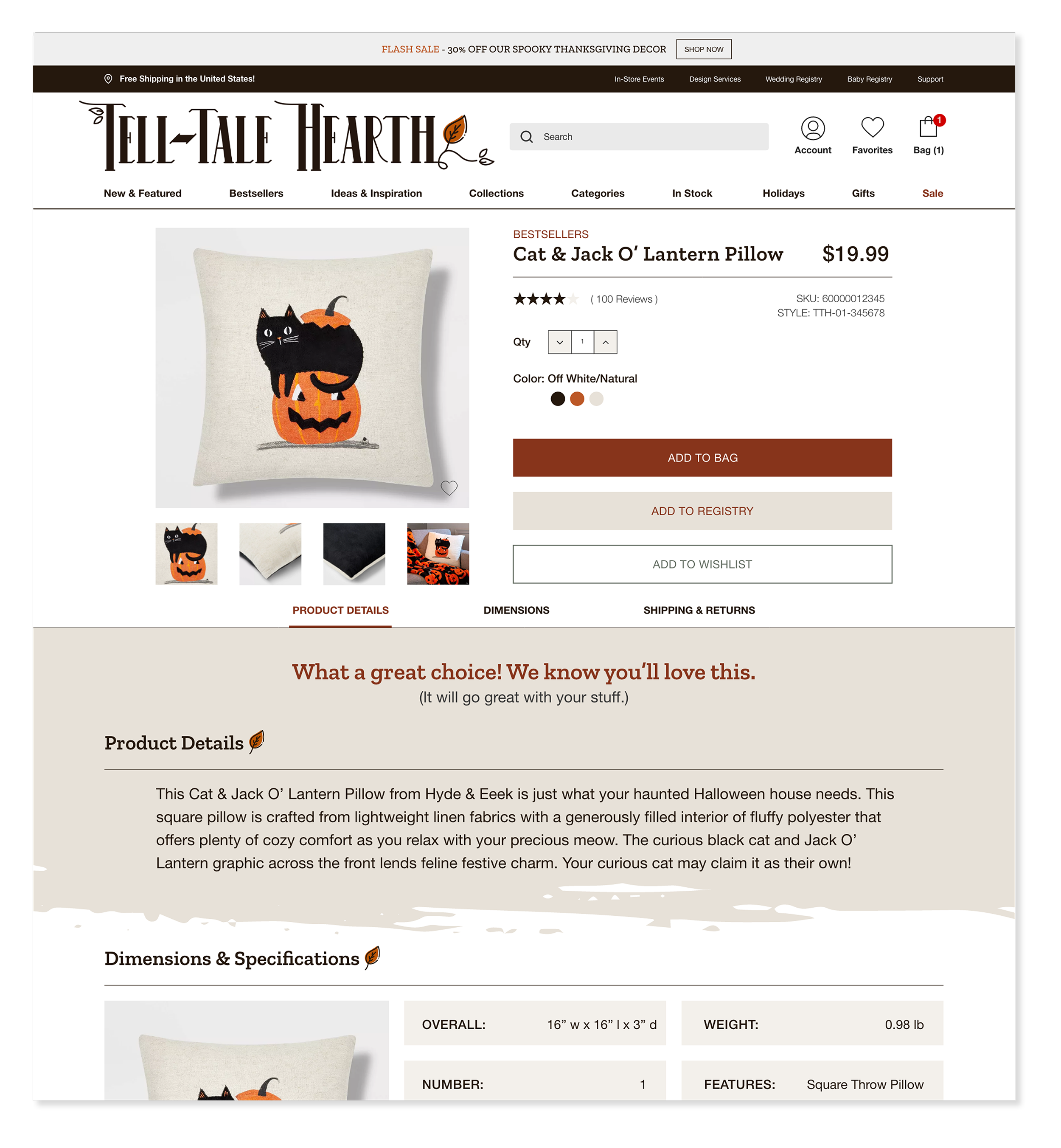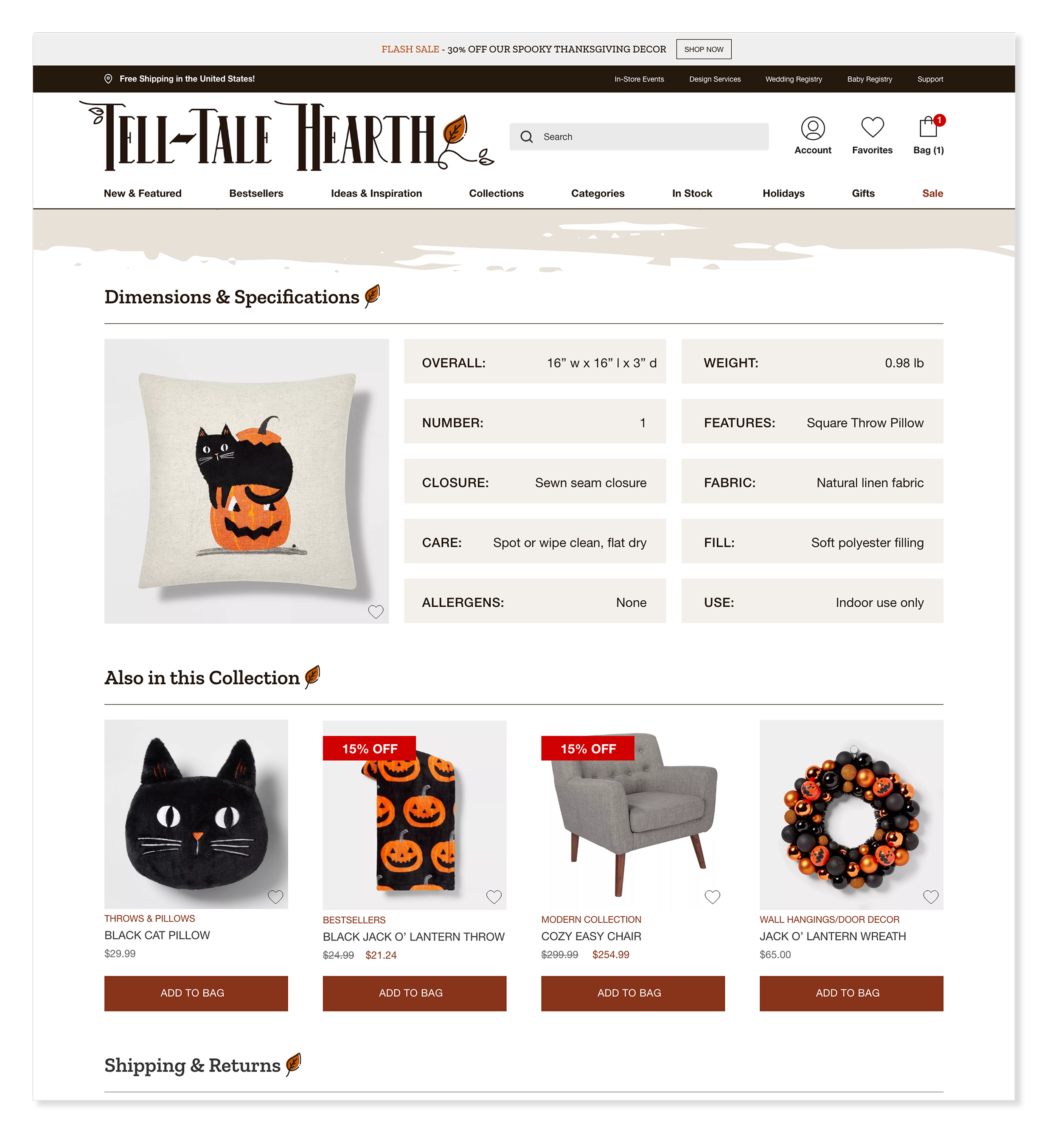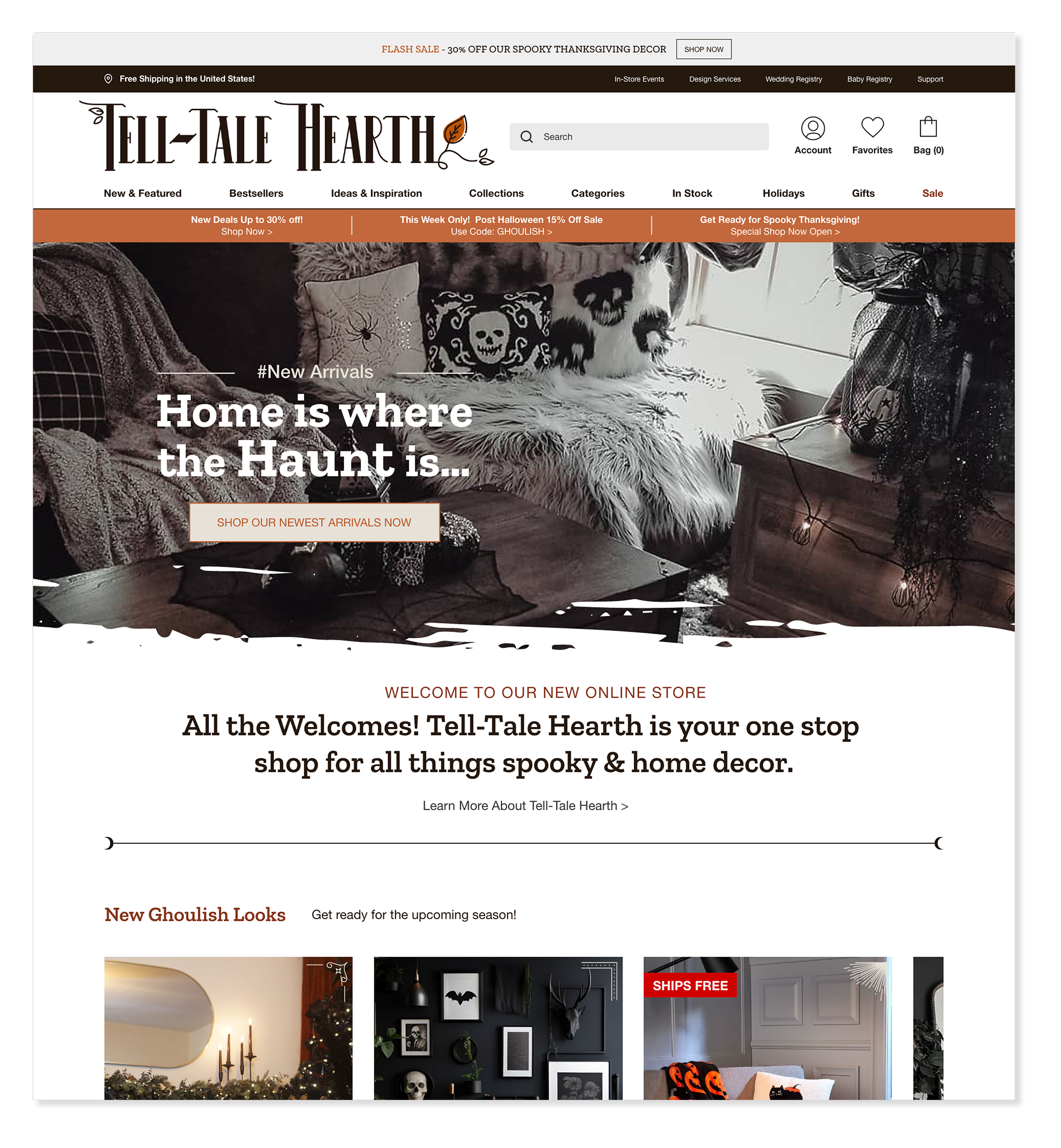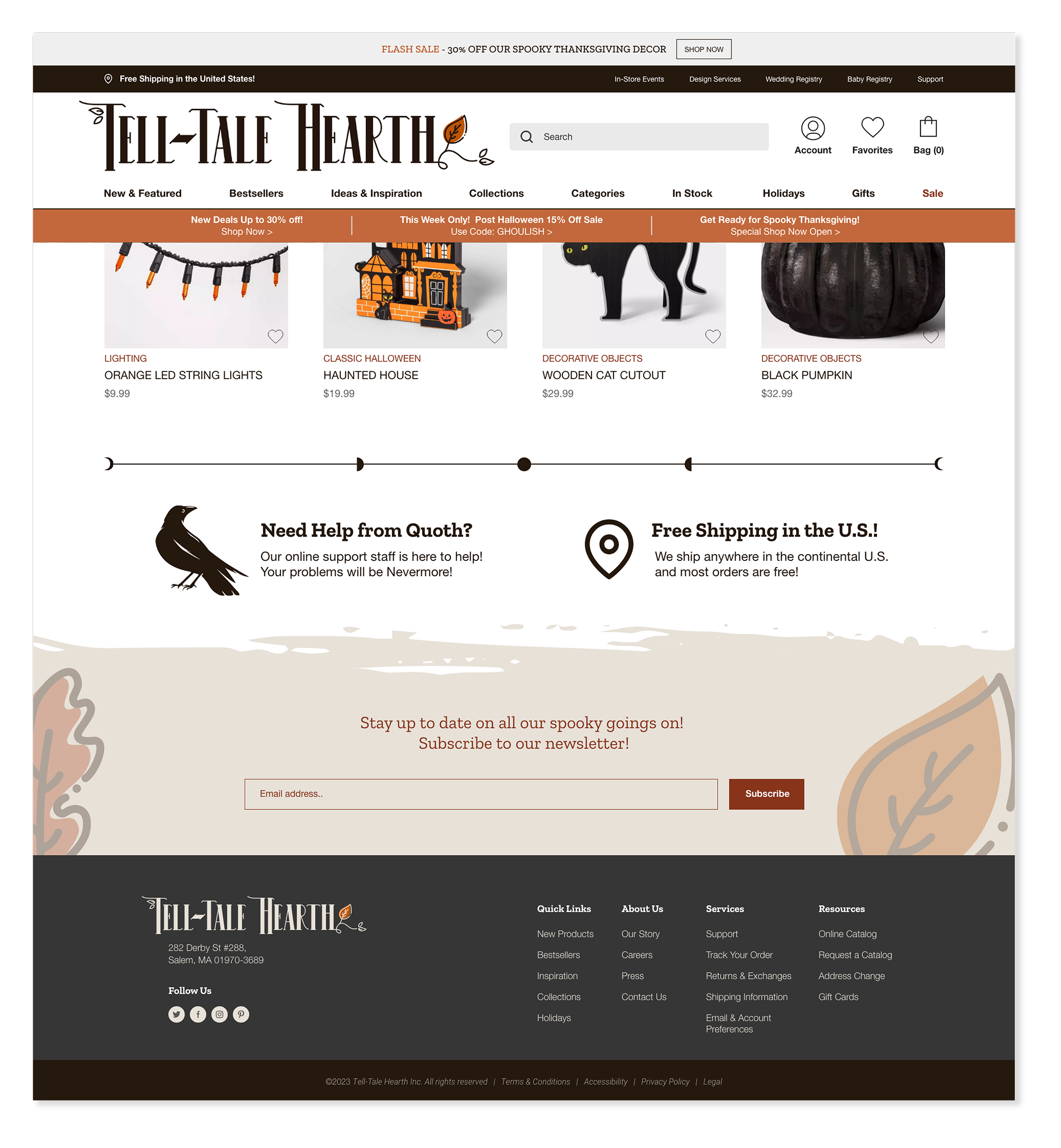 The homepage served as the introduction to Tell-Tale Hearth’s identity. The goal was to draw users into the atmosphere immediately while maintaining clarity and orientation. Featured collections, supporting imagery, and a structured layout worked together to establish tone without overwhelming the experience.