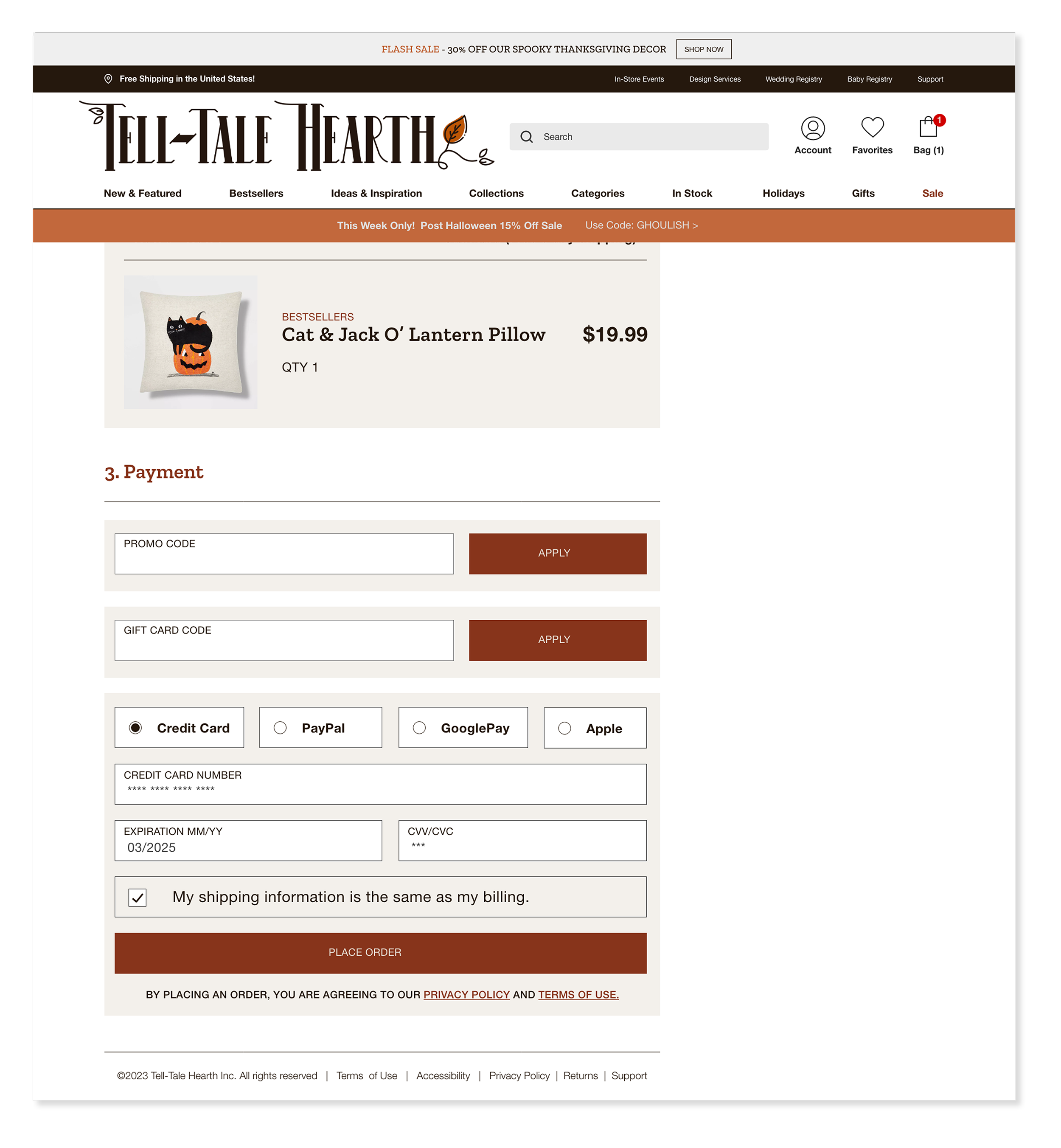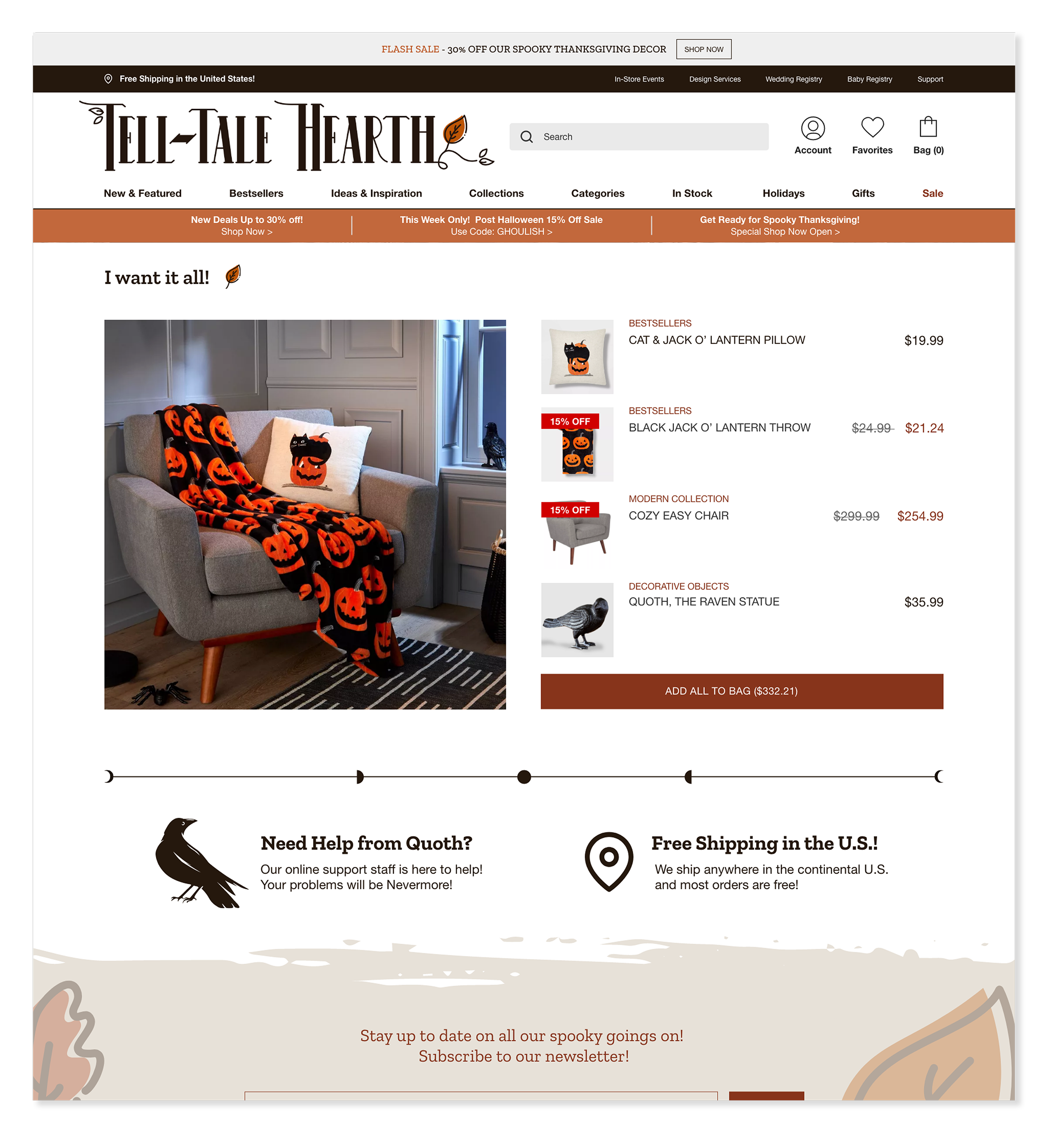With a clear creative direction established, I moved into production by defining the structure and flow of the Tell-Tale Hearth experience. This phase focused on translating the brand’s tone into layouts that felt familiar to e-commerce users while still supporting a rich, atmospheric presentation. My goal was to create an experience that guided users naturally from discovery through checkout without introducing friction.